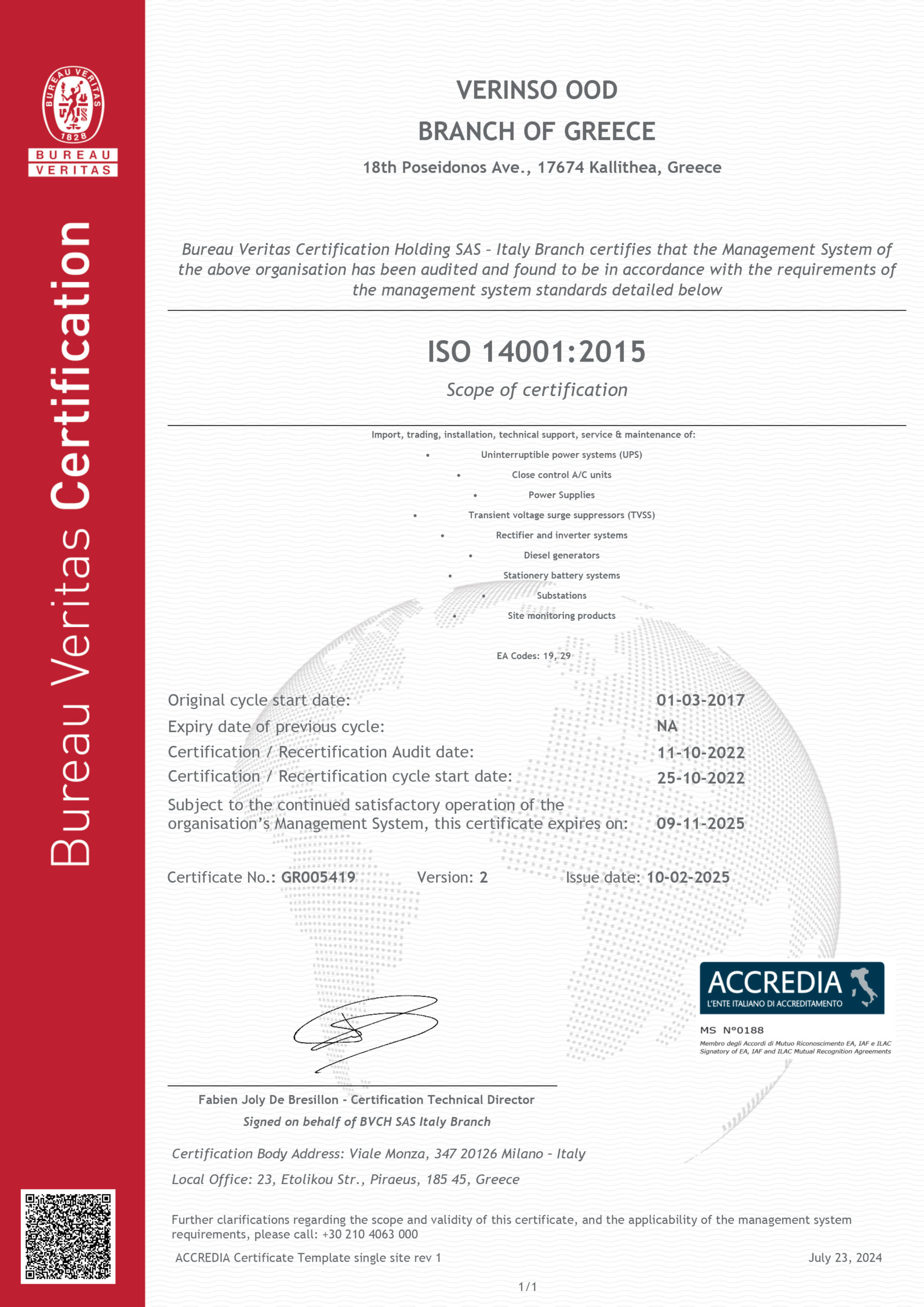 The aim of VERINSO OOD is to provide an integrated framework for the recording, monitoring and ultimate reduction of the environmental impacts associated with the operation of the Company’s facilities and its activities. The Company sets and records environmental objectives on an annual basis; these are defined and met in order to achieve the environmental scopes. In the context of this effort, the Company has implemented and is certified as per the internationally acknowledged ISO 14001 Environmental Management System, a fact certified by our official Environmental policy.